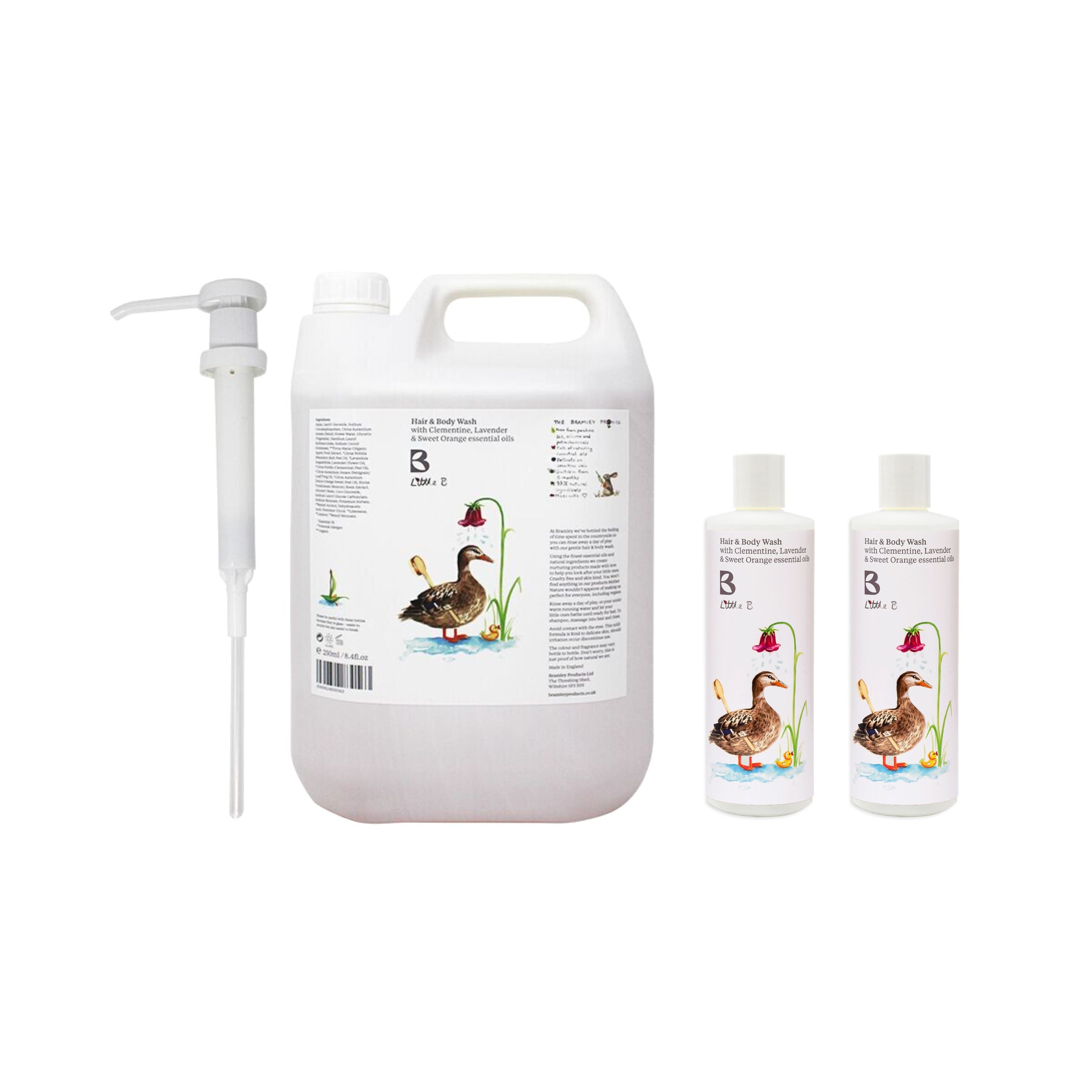 We decided to add a children's hair & body wash to the range because lots of customers were asking us if it was OK to use Bramley on their children. The answer is always yes, we're natural enough for all skins, but we thought it would be nice to create a product, especially for children. We use essential oils that are perfect for young skin and we've kept the fragrance simple too. Fingers crossed it will calm them before bed too (although we can't guarantee it)! This set contains a 5 litre Little B, a pump to go with it & two empty Little B bottles (with caps).